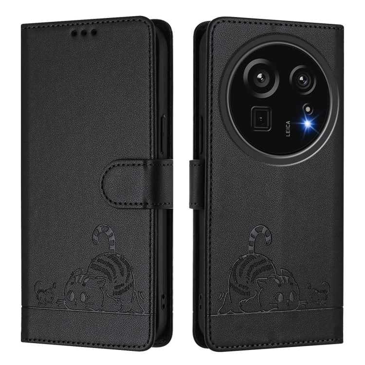 Funda de Cuero Rfid para Sharp Aquos R9 Pro con Estampado de Rata y Gato en Relieve y Cordón (Negro)