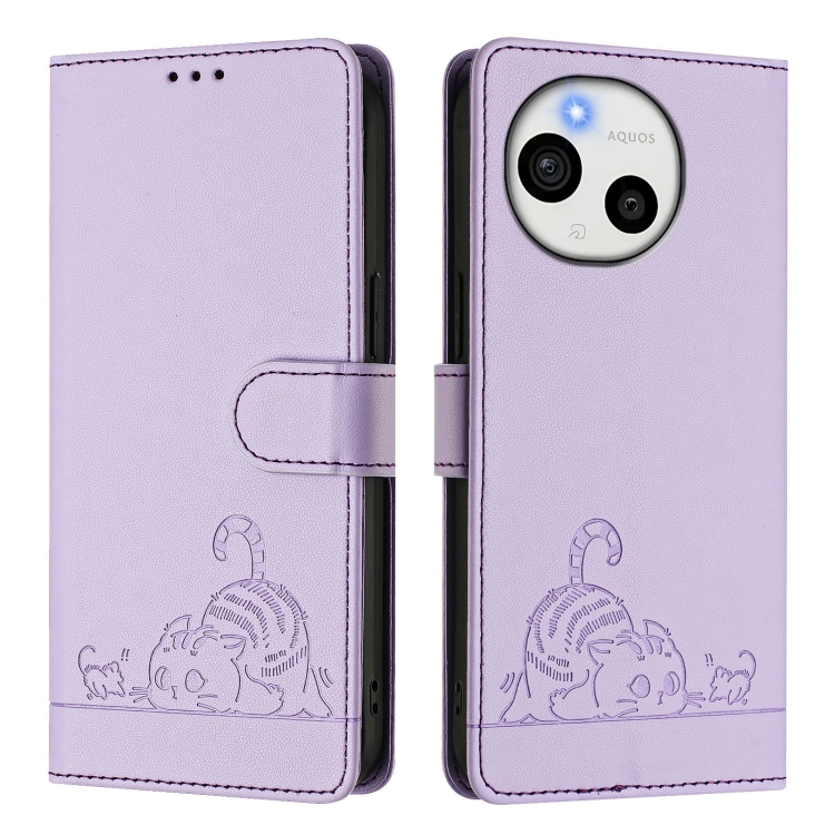 Funda de Cuero Rfid para Sharp Aquos Sense9 con Estampado de Rata y Gato en Relieve y Cordón (Morado)