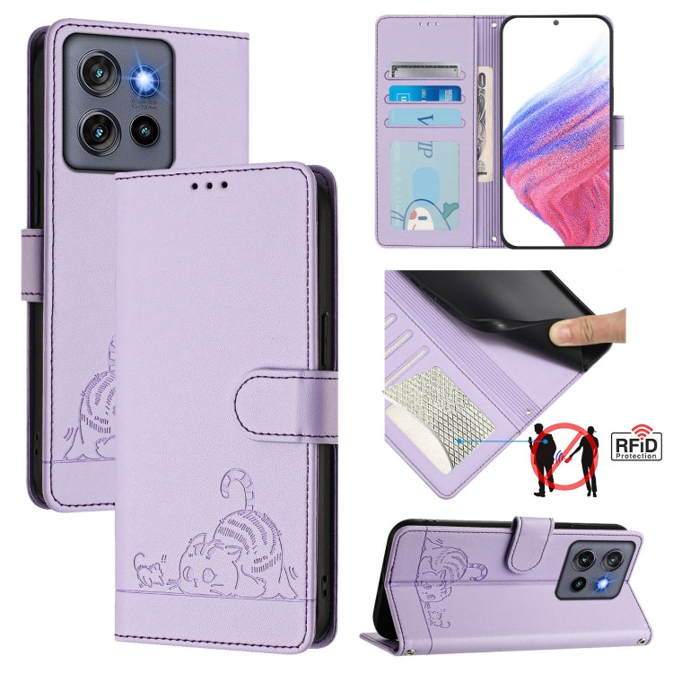 Funda de Cuero Rfid para Motorola Edge 50 Neo con Estampado en Relieve de Gato y Rata y Cordón (Morado)