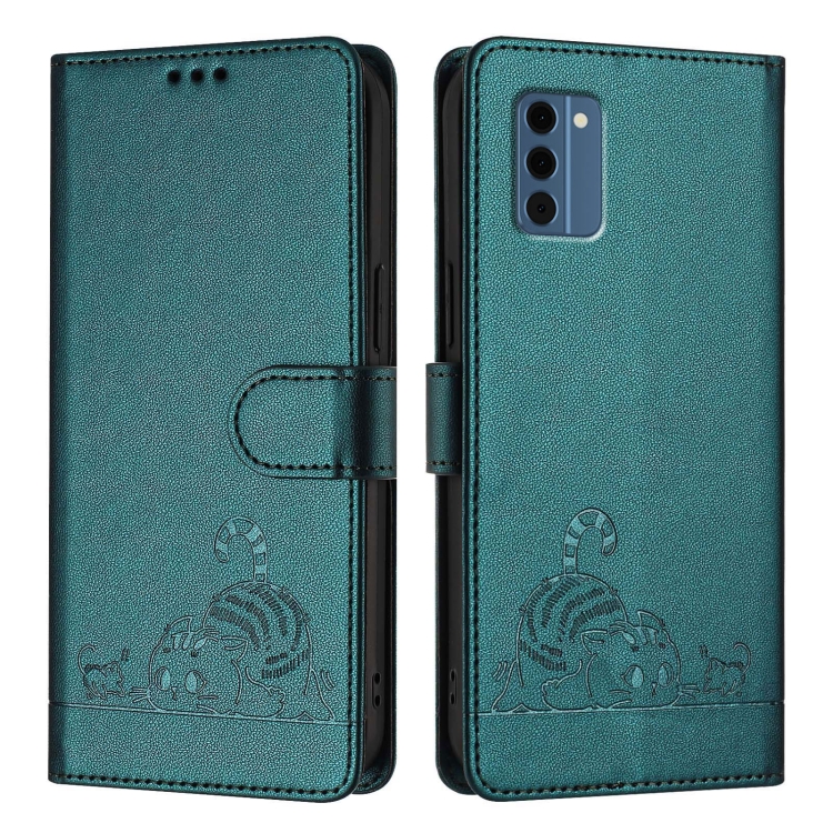 Funda de Cuero Rfid con Relieve de Gato y Rata para Nokia C300 con Cordón (Verde Pavo Real)