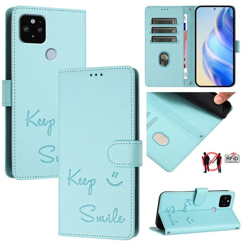 Funda de Cuero Rfid con Relieve Sonriente para Google Pixel 5 XL y Pixel 4A 5G (Verde Menta)