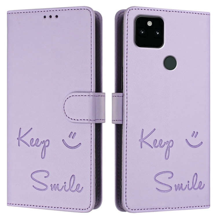Funda de Cuero Rfid con Relieve Sonriente para Google Pixel 5A (Morado Claro)