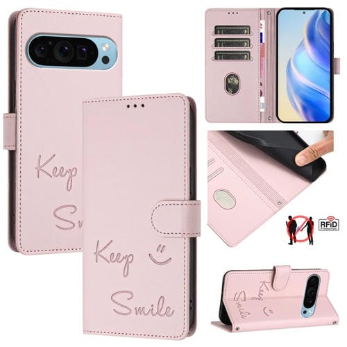 Funda de Cuero Rfid con Relieve Sonriente para Google Pixel 9 y Pixel 9 Pro (Rosa)
