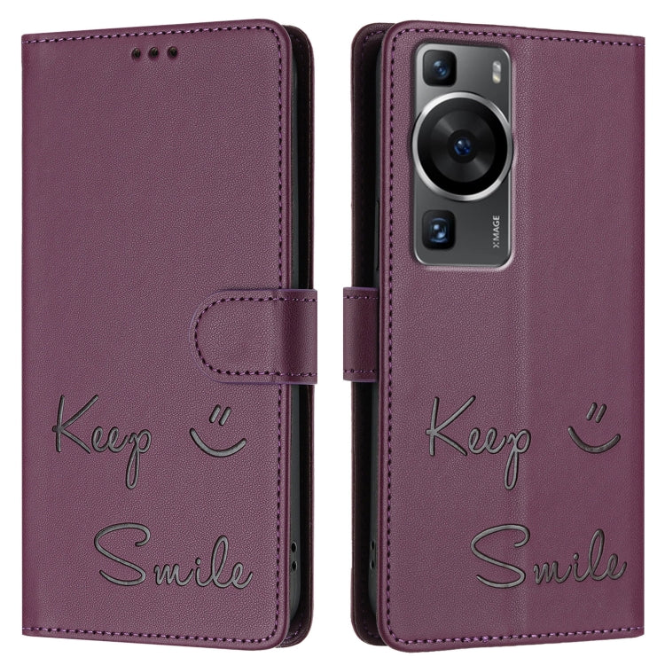 Funda de Cuero Rfid con Relieve Sonriente para Huawei P60 y P60 Pro (Violeta)