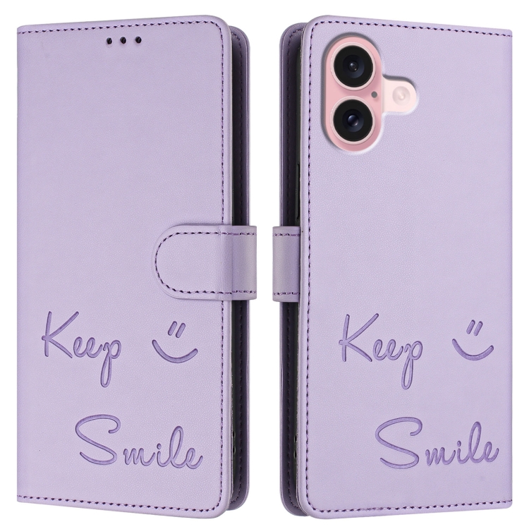 Funda de Cuero Rfid para iPhone 16 con Relieve Sonriente (Morado Claro)