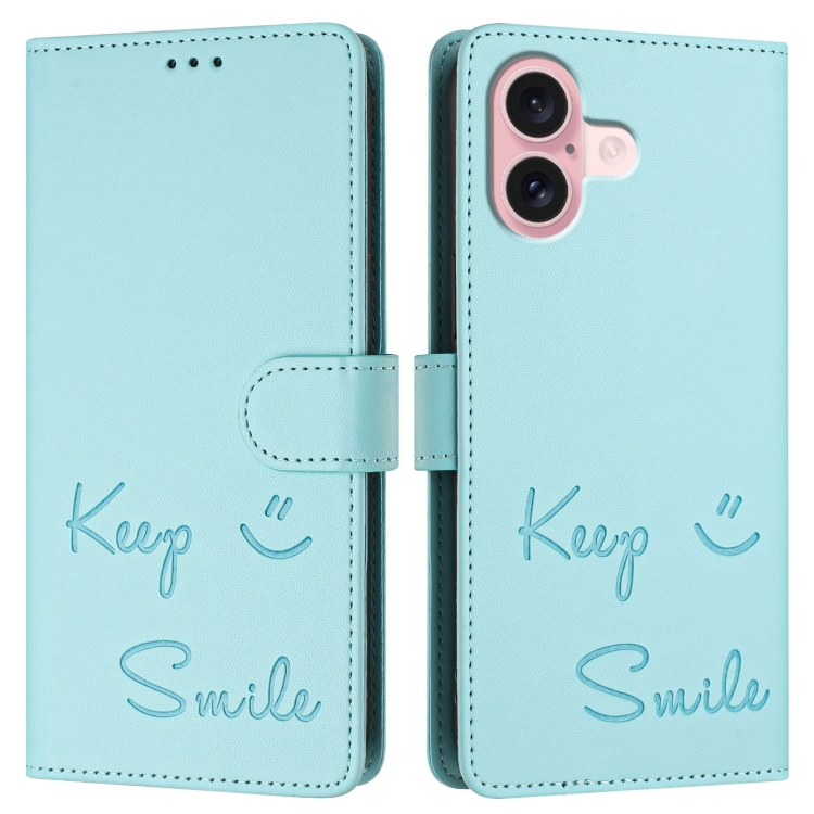 Funda de Cuero Rfid para iPhone 16 con Relieve Sonriente (Verde Menta)
