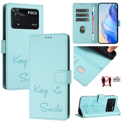 Funda de Cuero Rfid con Relieve Sonriente para Xiaomi Poco M4 Pro 4G (Verde Menta)