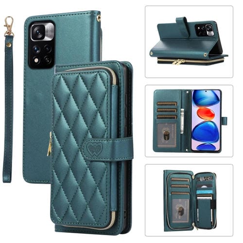 Funda de Cuero Tipo Billetera con Cremallera Completa y Diseño Rombal para Redmi Note 11 Pro (Verde)