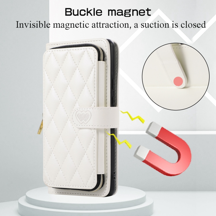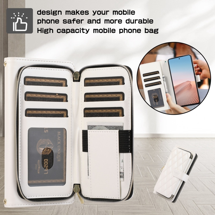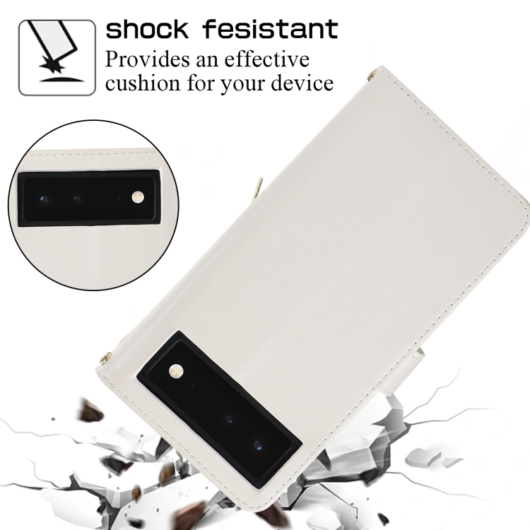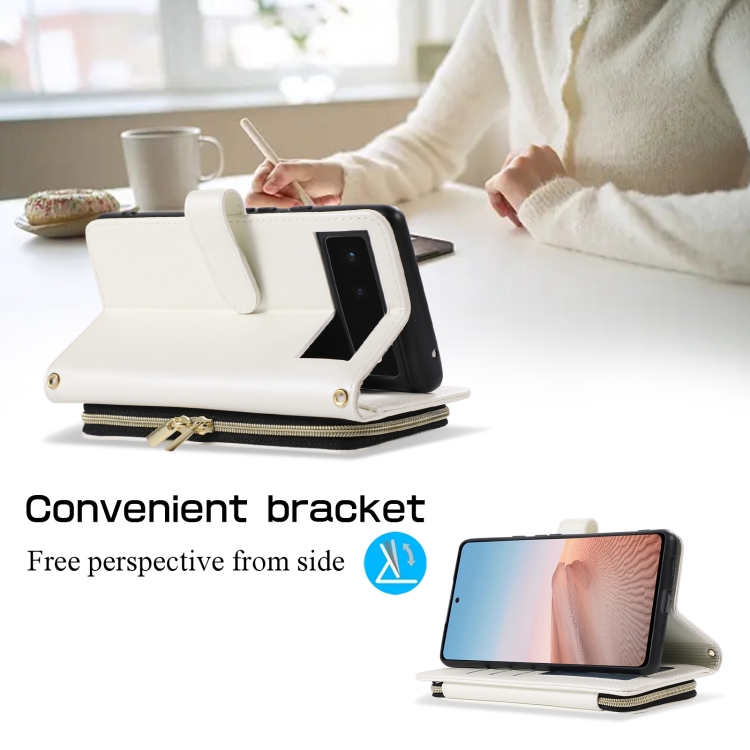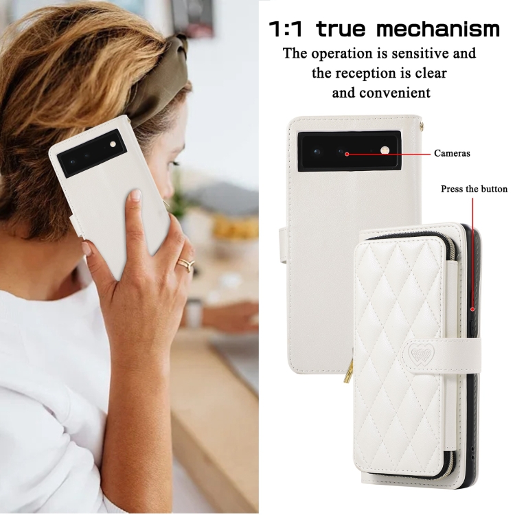 Funda de Cuero Tipo Billetera con Cremallera Completa y Diseño Romboidal para Google Pixel 6 (Blanca)