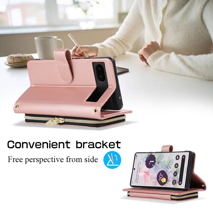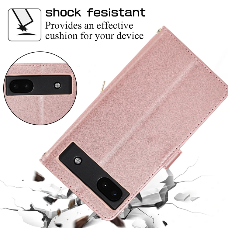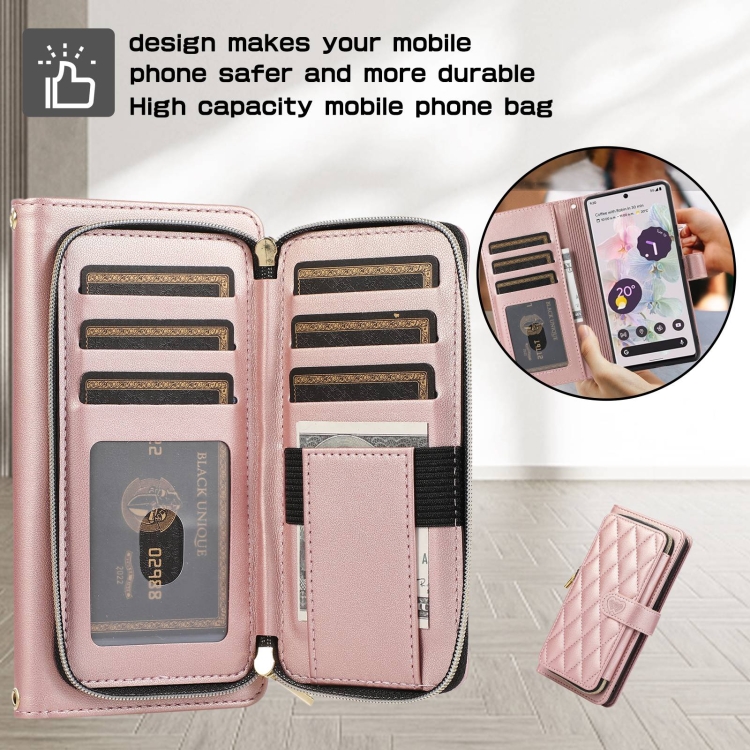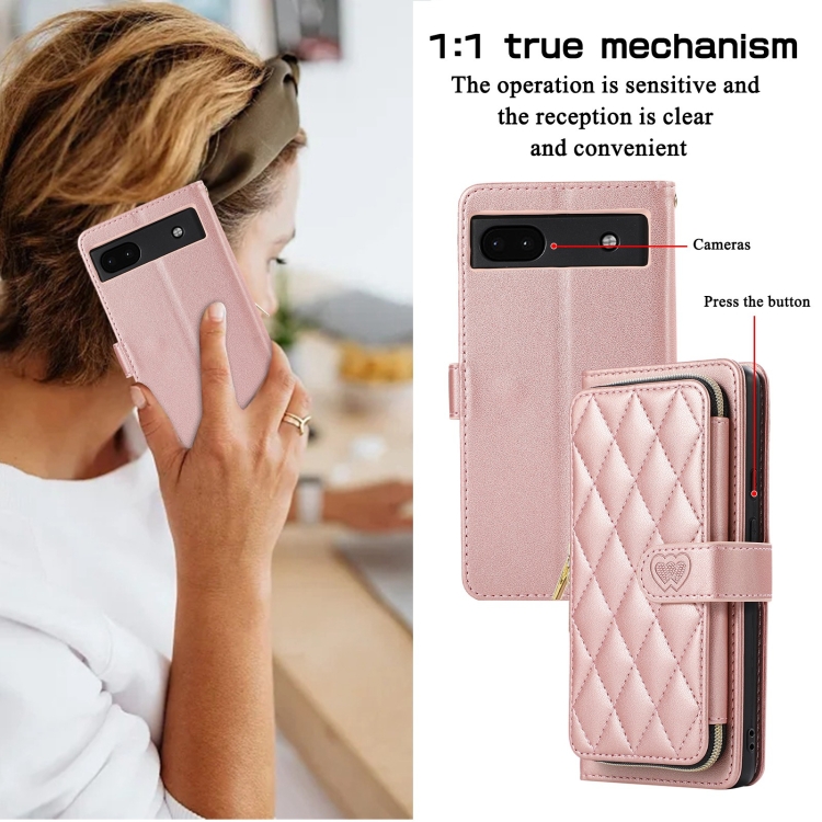 Funda de Cuero Tipo Billetera con Cremallera Completa y Diseño Romboidal para Google Pixel 6A (Oro Rosa)