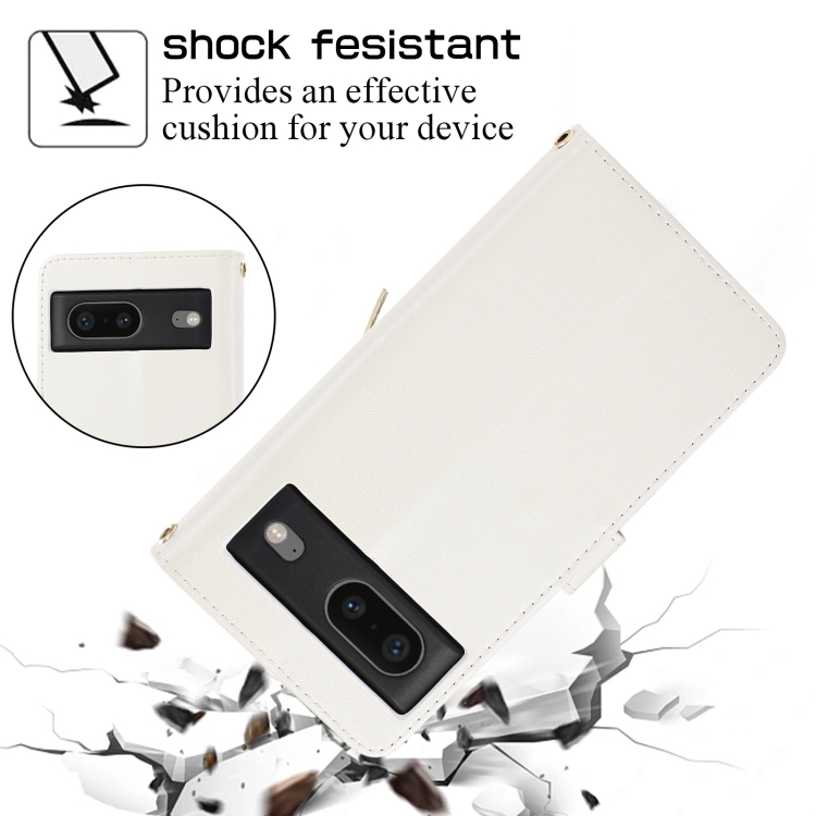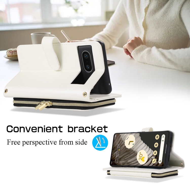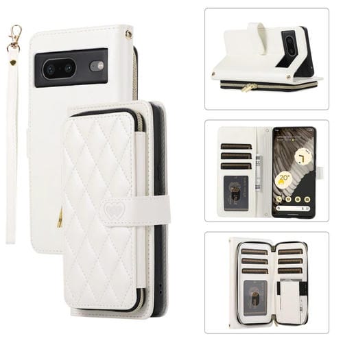 Funda de Cuero Tipo Billetera con Cremallera Completa y Diseño Romboidal para Google Pixel 7 (Blanca)