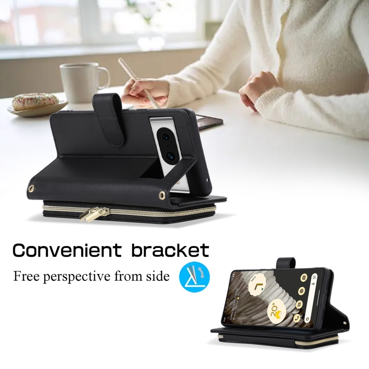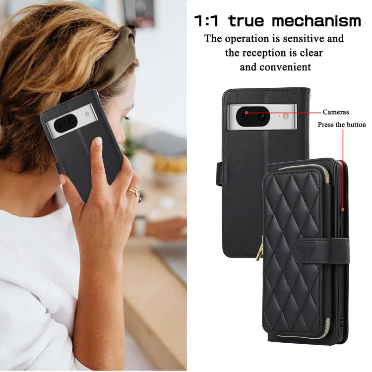 Funda de Cuero Tipo Billetera con Cremallera Completa y Diseño Romboidal para Google Pixel 8 (Negra)