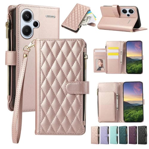 Funda de Cuero Tipo Billetera con Cremallera Rombal para Redmi Note 13 Pro+ 4G/5G (Oro Rosa)