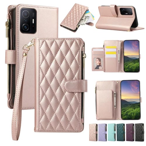 Funda de Cuero Tipo Billetera con Cremallera Rombal para Xiaomi Mi 11T (Oro Rosa)