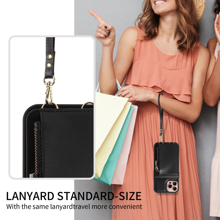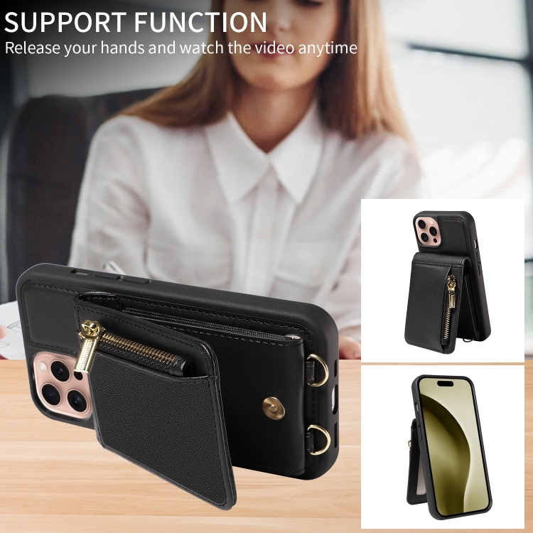 Funda Tipo Billetera Cuero con Cremallera y Cordón Cruzado para iPhone 16 Pro (Negra)