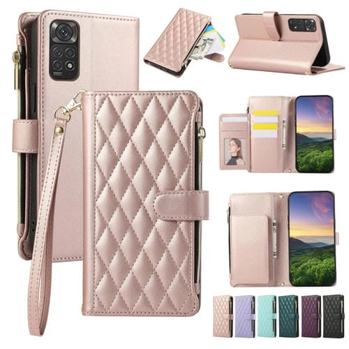 Funda de Cuero Tipo Billetera con Cremallera y Diseño Rombal para Redmi Note 11S (Oro Rosa)