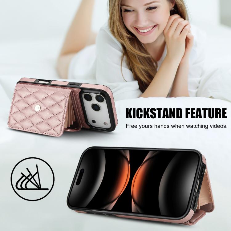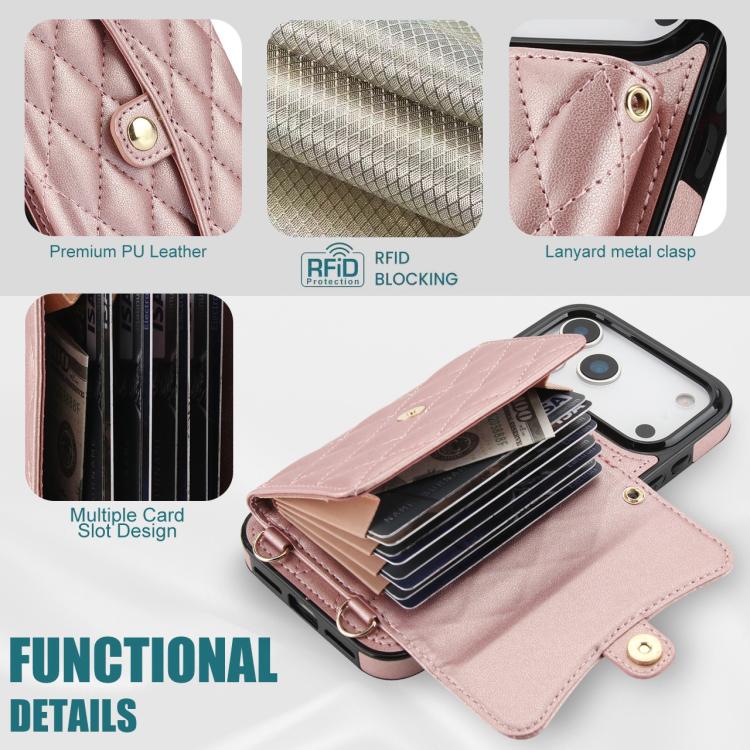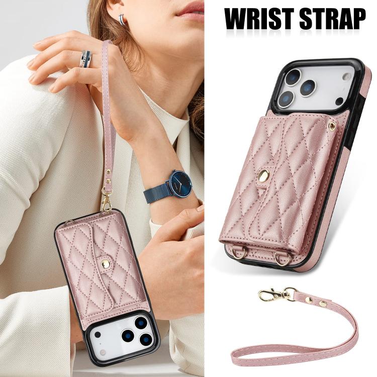 Funda de cuero tipo cartera horizontal con diseño rómbico y bandolera para iPhone 17 Pro Max (oro rosa)