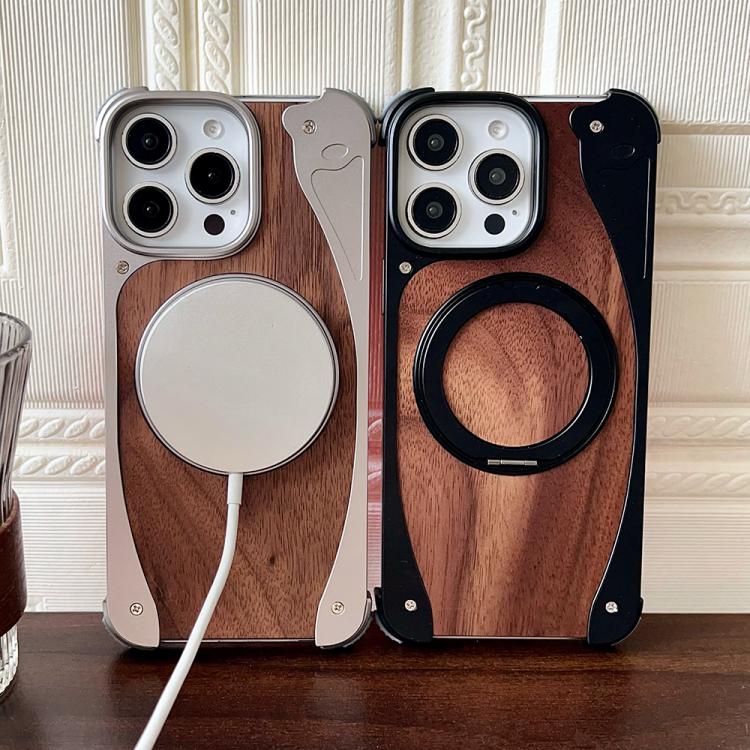 Funda de metal sin marco para iPhone 16 Pro Max, color nogal, con rotación de 360 grados y soporte MagSafe (color titanio)