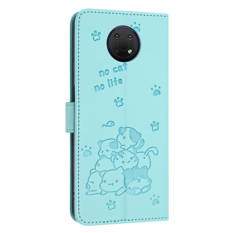 Funda de Piel para Nokia G10/G20/G300 con Diseño de Gatito en Relieve y Cordón (Verde Menta)