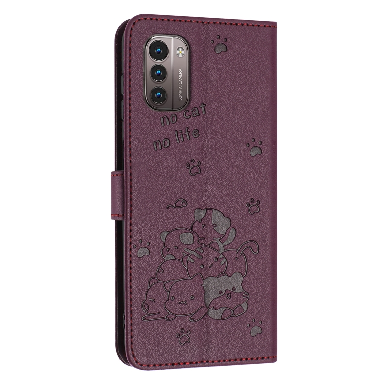 Funda de Piel para Nokia G11/G21 con Diseño de Gatito en Relieve y Cordón (Rojo Vino)