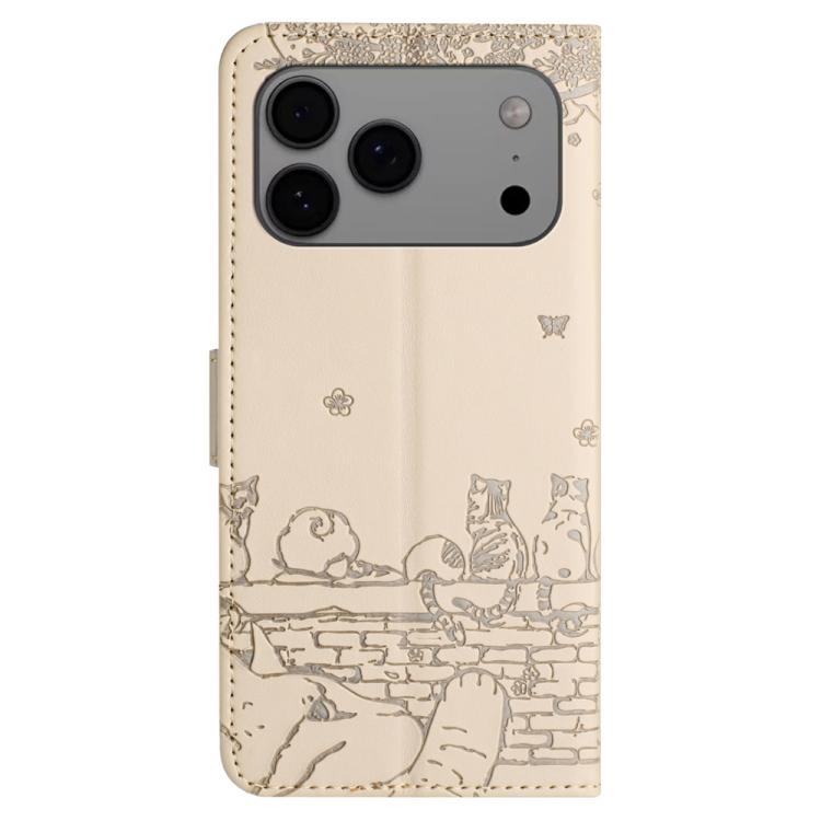 Funda de piel con estampado de gato y cordón para iPhone 17 Pro (beige)