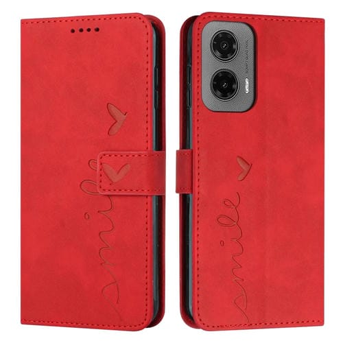 Funda de Piel con Relieve de Corazón para Motorola Moto G35 con Cordón Largo (Rojo)