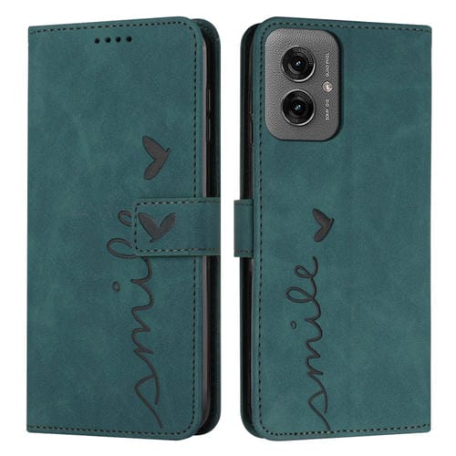 Funda de Piel con Relieve de Corazón para Motorola Moto G55 con Cordón Largo (Verde)