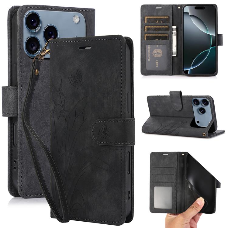 Funda de piel con relieve de mariposa y orquídea para iPhone 17 Pro (negra)