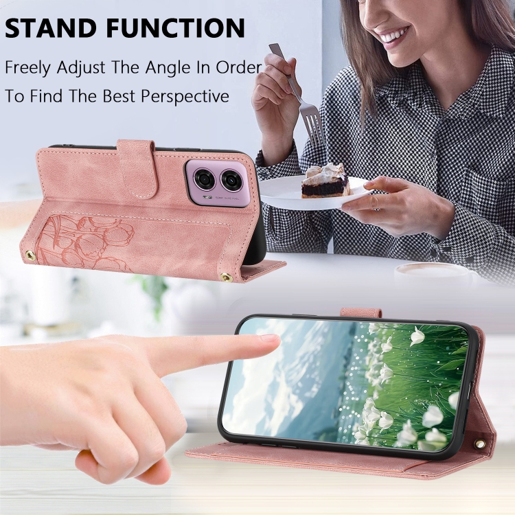 Funda de Piel con Relieve de Tulipanes para Motorola Moto G 5G (2024) con Cordón (Rosa)