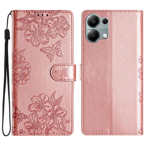Funda de Teléfono de Pu con Relieve de Piel de Mariposa y Diseño de Flor de Cerezo para Redmi Note 13 Pro 4G (Oro Rosa)