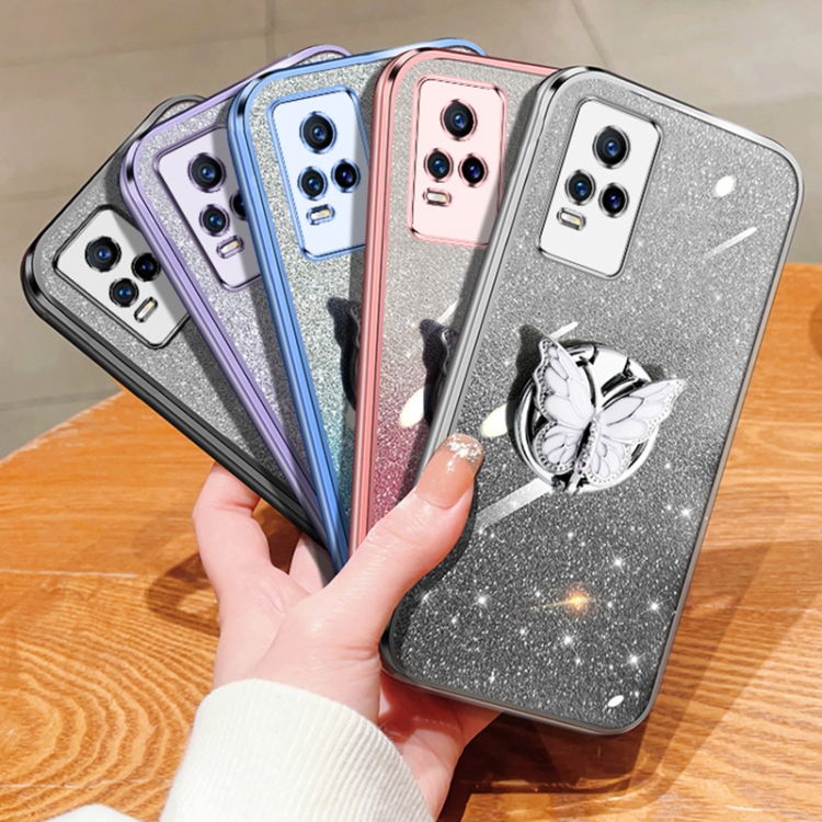 Funda de Teléfono de TPU con Soporte para Mariposas y Purpurina Degradada Plateada para Vivo V21E 4G / Y73 4G 2021 (Plateada)