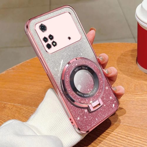 Funda de Teléfono de TPU con Soporte Redondo y Purpurina Degradada Plateada para Xiaomi Poco M4 Pro (Rosa)