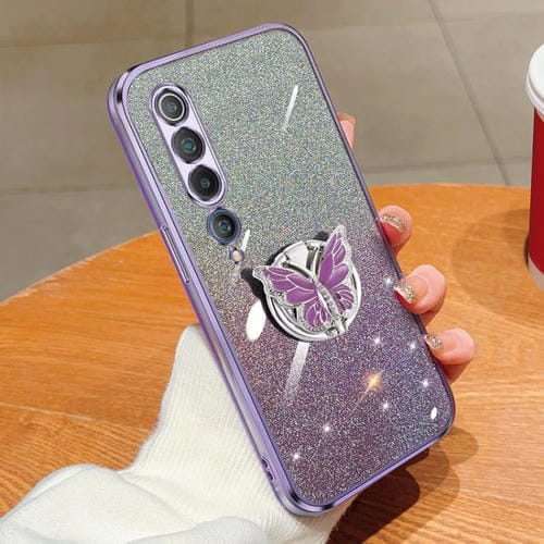 Funda de TPU con Soporte para Mariposa con Purpurina Degradada Plateada para Xiaomi Mi 10 (Morado)
