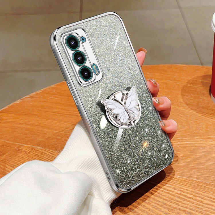 Funda TPU con Soporte para Motorola Edge 20 con Diseño Mariposa y Purpurina Degradada (Plateada)