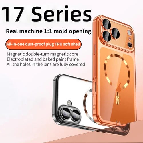 Funda de TPU MagSafe para iPhone 17 con revestimiento de pintura, tapón antipolvo y protector de lente (naranja)