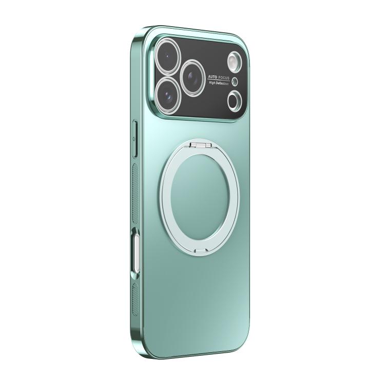 Funda MagSafe electrochapada para iPhone 17 Pro con soporte giratorio de 360 grados y cubierta para lente (verde claro).