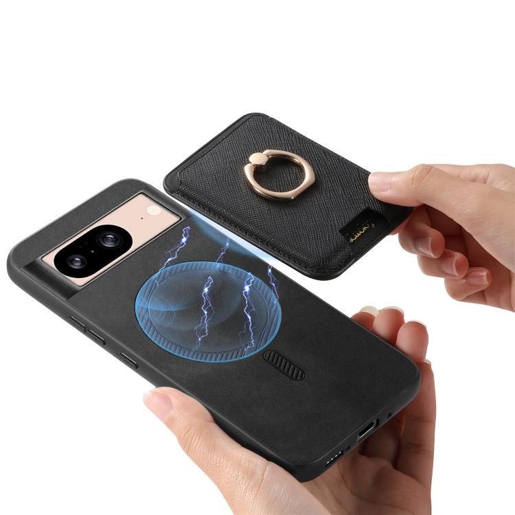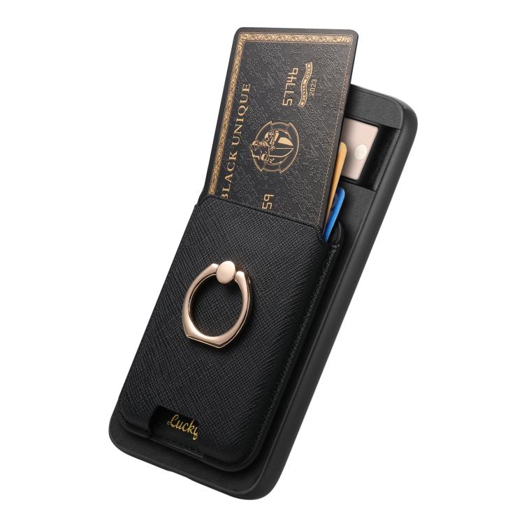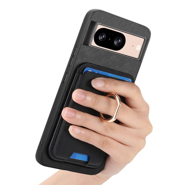 Funda para Google Pixel 8 con Ranuras para Tarjetas y Anillo de Cuero Diseño Retro Cruzado (Negro)
