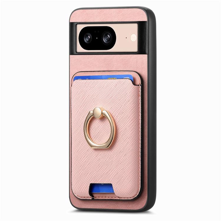 Funda para Google Pixel 8 con Ranuras para Tarjetas y Anillo de Cuero Diseño Retro Cruzado (Rosa)