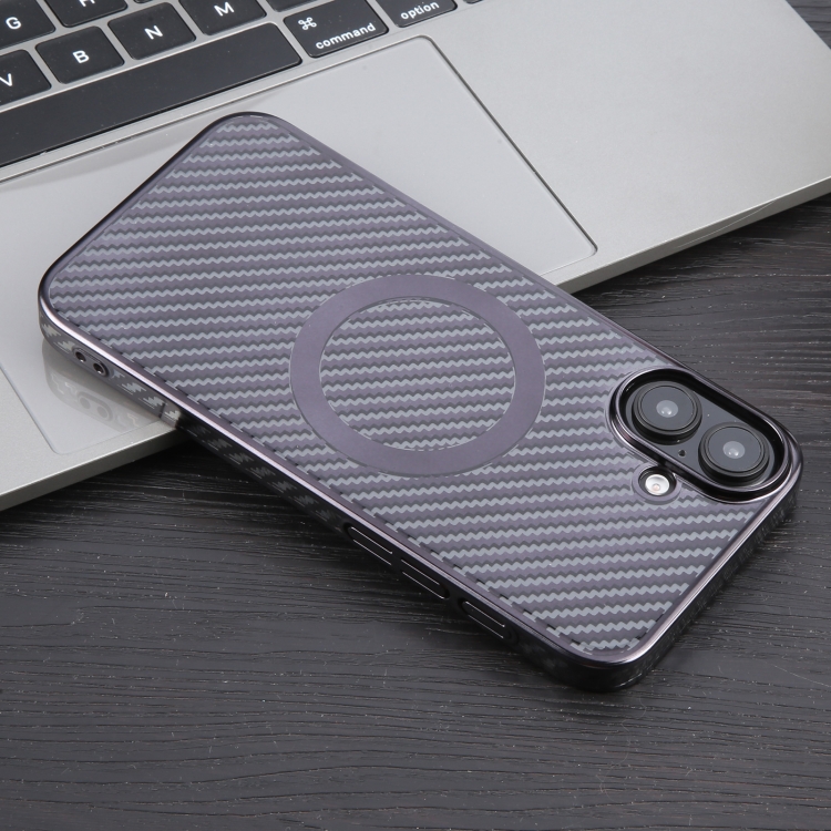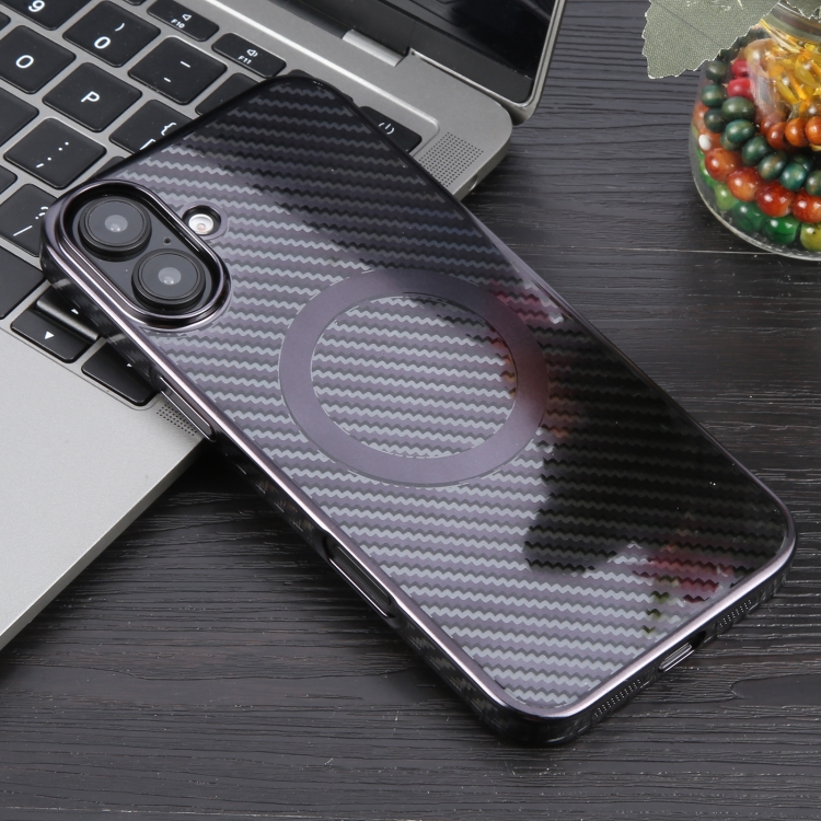 Funda para iPhone 16 Carcasa PC Fibra de Carbono Transparente Revestimiento Magsafe 6D (Negro Estrellado)