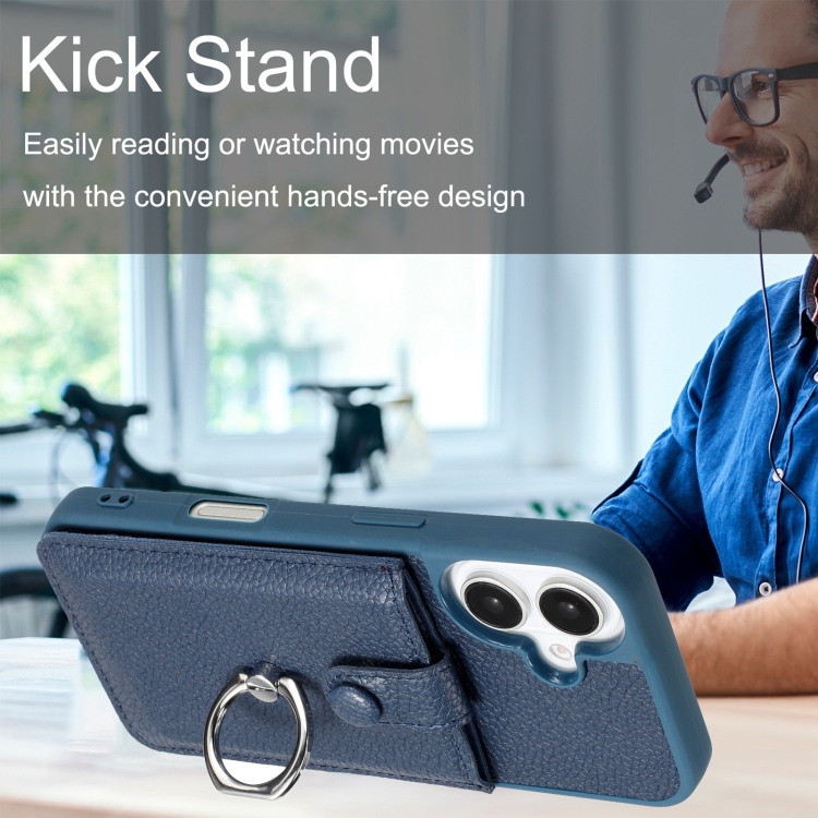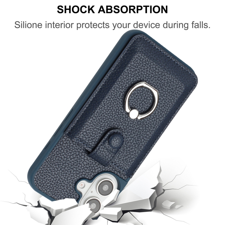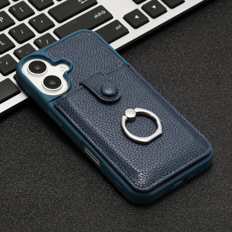 Funda para iPhone 16 Textura de Lichi con Diseño de Tarjeta y Soporte para Anillo (Azul)