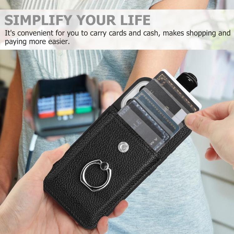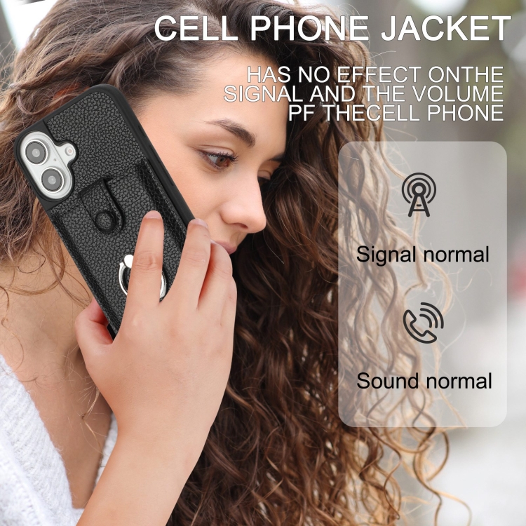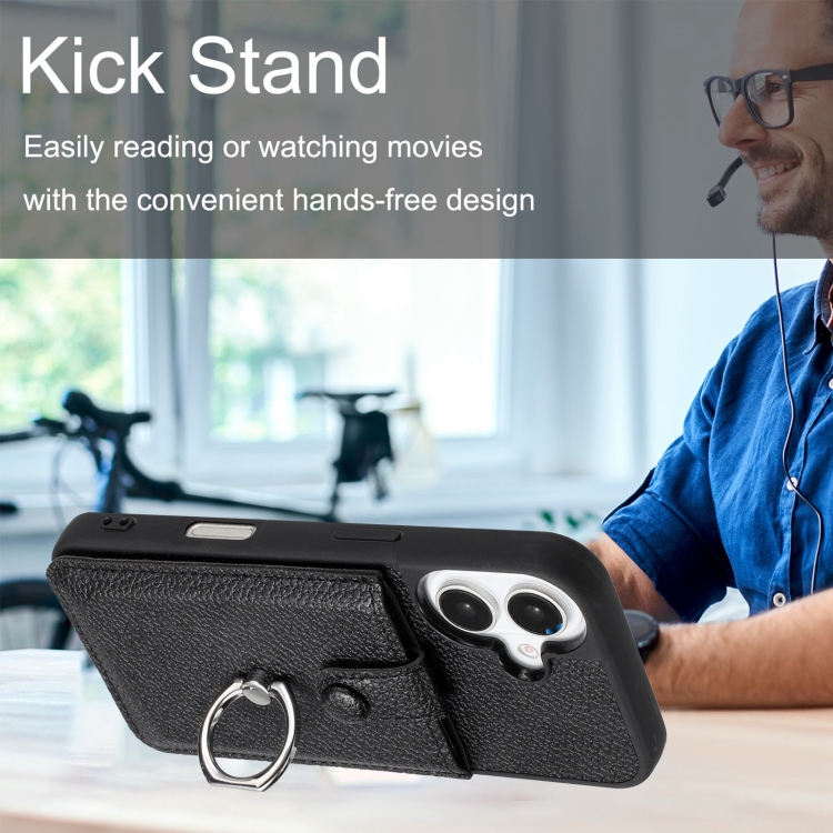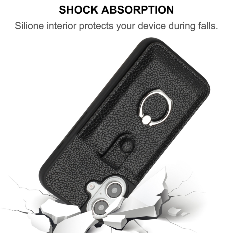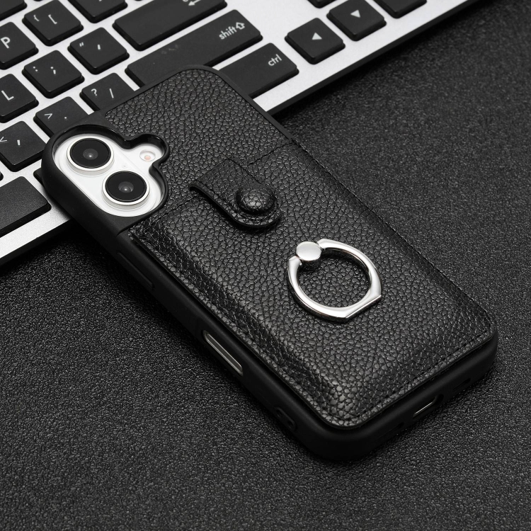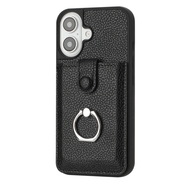 Funda para iPhone 16 Textura de Lichi con Diseño de Tarjeta y Soporte para Anillo (Negro)