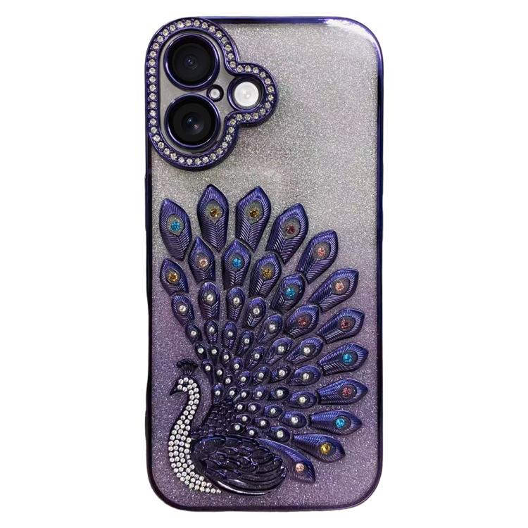 Funda para iPhone 17 de TPU electrochapado con relieve de pavo real y purpurina de diamantes de imitación, con protector de lente (morado).