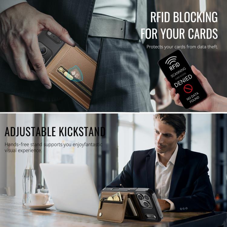 Funda para iPhone 17 Pro Max JEEHOOD J12 con cremallera RFID MagSafe y tarjetero (marrón)