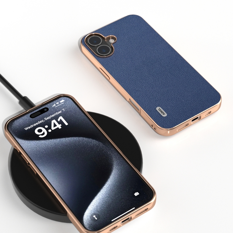 Funda para Teléfono Abeel Serie Luolai Cuero Genuino Marco Galvanizado iPhone 16 (Azul Oscuro)