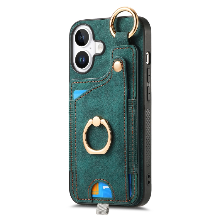 Funda para Teléfono Apple iPhone 16 con Anillo Tarjetero Asa Estilo Retro (Verde)