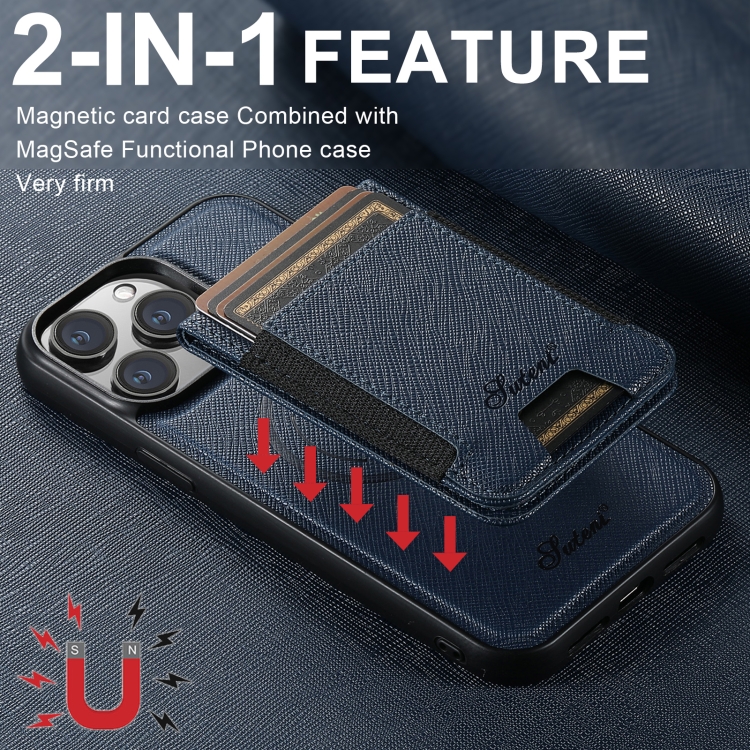 Funda para Teléfono Suteni H17 Cuero de Grano Cruzado con Billetera Desmontable Magsafe para iPhone 16 Pro (Azul)