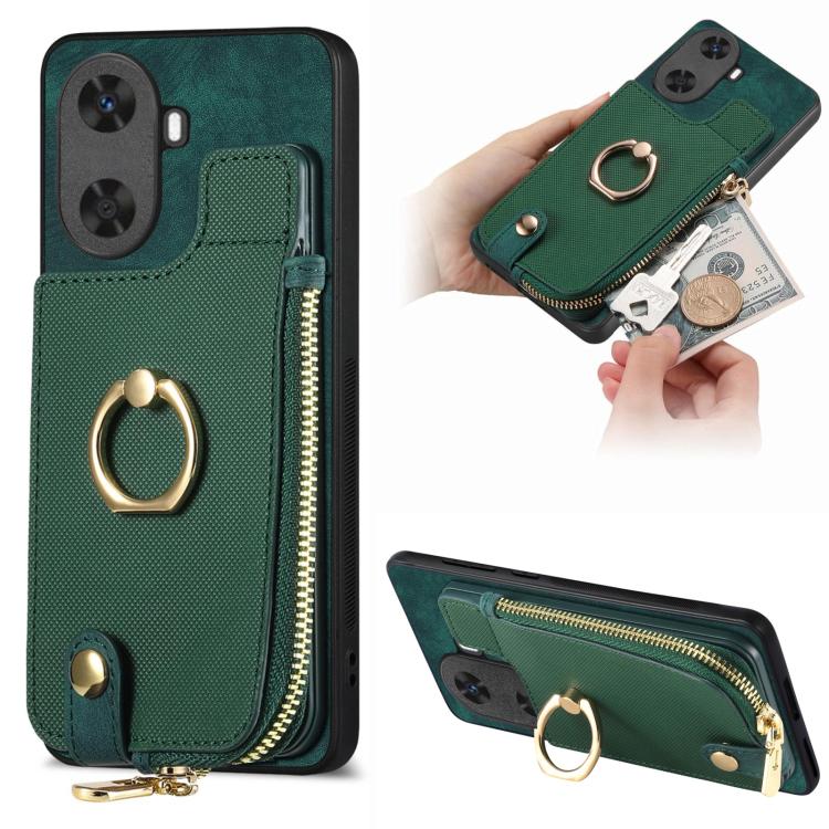 Funda para Teléfono Huawei Enjoy 60 con Cremallera Vertical y Anillo de Cuero Cruzado (Verde)