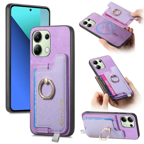 Funda para Teléfono con TaRJetero y Anillo de Cuero con Diseño Retro Magsafe para Xiaomi Redmi Note 13 4G (Morado)