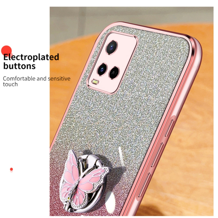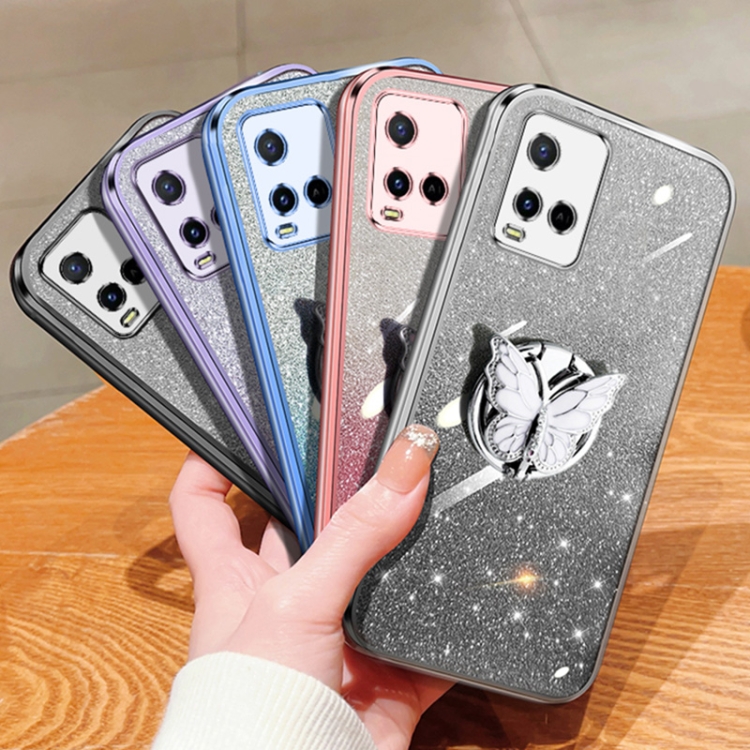 Funda para Teléfono de TPU con Soporte para Mariposas con Purpurina Degradada Plateada para Vivo Y21 (Morado)