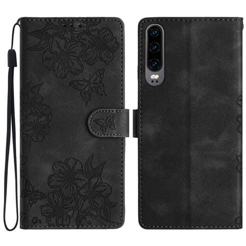 Funda para Teléfono Huawei P30 con Diseño de Mariposa y Flores de Cerezo en PU (Negra)
